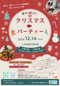 OHANAHOUSE クリスマスパーティー2025🎄🌟 今年もこの季節がやってきました!🎅今回は午前・午後の2部制で行います。 ※飼い主様は無料 お持ち物 詳細はチラシをご覧ください♪